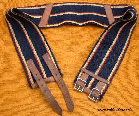 - navy blue, white, yellow & red. The diagonal leather pieces featured on the belt were worn on the right
