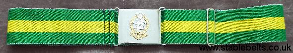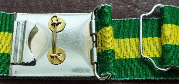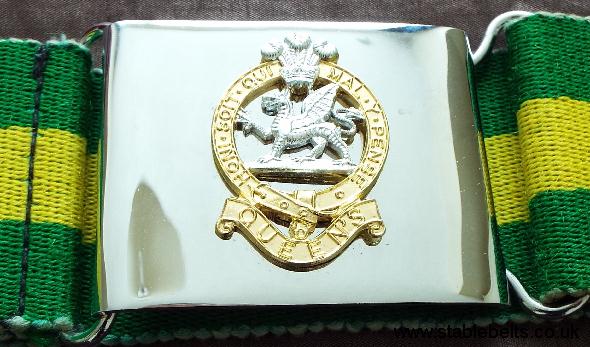 - A Queen’s Regiment buckle on an unusual coloured belt (The Queen’s Regiment standard coloured stable belt is blue)