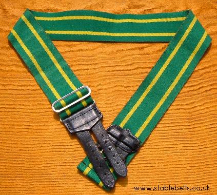 Green with 2 x 5 mm horizontal yellow stripes positioned 20mm from the top and 20mm from the bottom of the belt with black leather straps