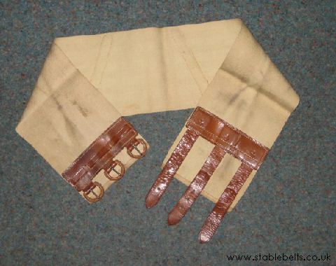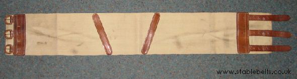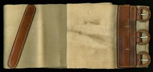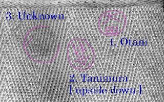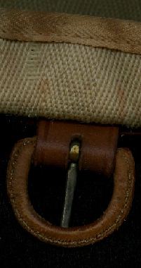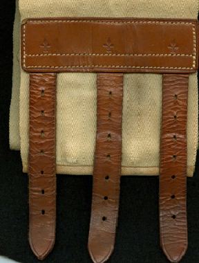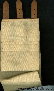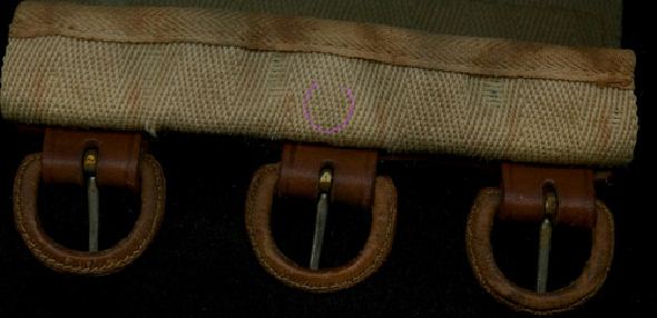 | This belt is what I call '1880'; it is canvas & leather, with dimensions of 31.5 x 4.75. It will fit a waist from 28 ~ 32; and is 30.5 at the center strap hole. Note the 5 diagonal back support bars at the rear of the belt these are leather matching the same weight of the other leather parts. The canvas is herringbone weave. The leather patch securing the three straps has a fleur-de-lis stamp above each strap, so I think the belt might be French; the number 32 is stamped on the base of the center strap (which matches the largest size the belt could accomodate). The French had a long-time military mission to Japan from about 1868~1878. The Japanese Ministry of War (or whatever it was called then) attempted to cancel the French contract and hire Germans officers after the French lost the Franco-Prussian War; however, the Japanese General Staff (typically conservative and not wanting change) were opposed; it took until about 1880 before Germans finally replaced the French. The reverse side has some arsenal or acceptance stamps the two that I can read are generic Japanese family name chops [hanko] that are still sold today. #1 is Otani (sometimes spelled Ootani or Ohtani); #2 is Tanimura; and #3 is illegible. There is a fourth stamp under the middle buckle and it looks to be similar to stamp #1: Otani (but I cannot tell for certain). Additionally, there is a pencil or ink mark on the top edge opposite the buckles. This mark is CAo -- and I have no idea of its significance. With thanks to Guy H. Power