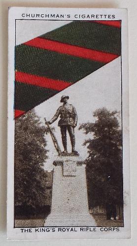 ![]() With Thanks to Jerry Carter In full dress the King's Royal Rifle Corps, better known as the 60th Rifles wear rifle green with scarlet facings. From Churchman's Well Known ties 2nd series. |