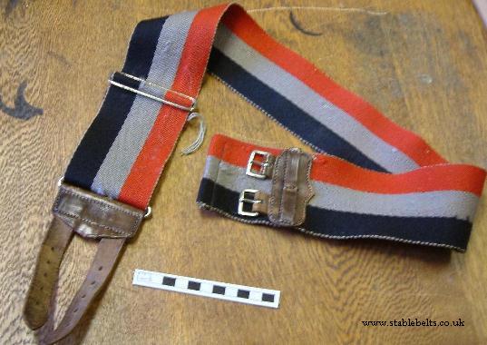 BELT COLOURS - red, pearl grey and black. This belt belonged to me, I used it and wore it whilst a driver in the MT section of the 4/5 Battalion Royal Leicestershire Regiment TA from 1964-68. It was not issued to everyone and I cannot remember how I got it but I was C.O.s driver so I assume it was issued to me for that use. With thanks to Derek J Pinchess Stable belt - The new officers stable belt in regimental colours is optional and costs 14/6d. at Messers Conway Williams. It is for wear in shirt sleeve order or KD when not on parade with troops The Green Tiger - Autumn 1955, the Royal Leicestershire Regiment Journal The Red denotes Royal, the Pearl Grey, the Battle of Princeton and the Black commemorates the death of Gen Wolfe, it is claimed that six subalterns carried his coffin, however they are not the only regiment to make this claim