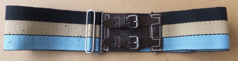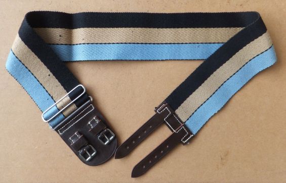 | BELT COLOURS - black stripe at the top, then buff and sky blue all of equal width, each separated by black stitching. OTHER INFORMATION - The Northamptonshire Regiment stable belt is worn with black stripe at the top. The stripes are approximately an inch wide (about 15/16ths) and there is black stitching separating the different colours. With thanks to Jacqueline A Minchinton, Records and Resources Management Officer, Northampton Museum and Art Gallery |