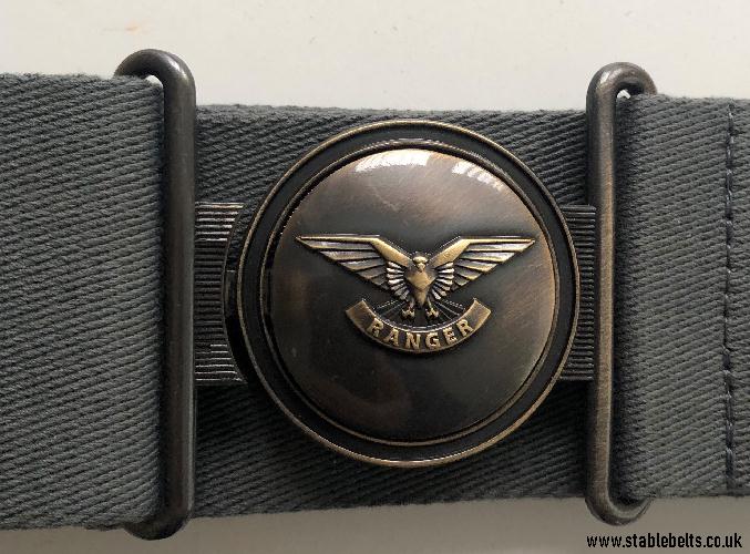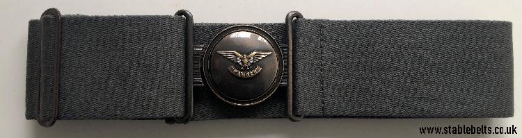 A unique gun-metal grey colour has been chosen for the regimental stable belt,taking inspiration from the peregrine Falcon's grey plumage. Stable belts will fasten at the front with a round metal buckle bearing the peregrine Falcon insignia from the cap badge. (2021).