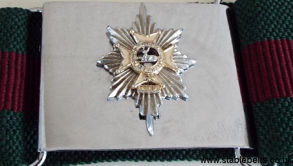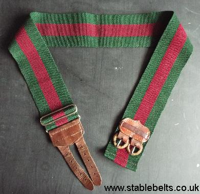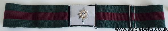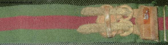 The green bands are 0.75 inches and the central maroon band is 1 inch, making the overall width 2.5 inches. The Worcestershire and Sherwood Foresters Regiment wear a similar coloured belt but the colours seem to be lighter and the bands are all 1 inch, making the overall width 3 inches.