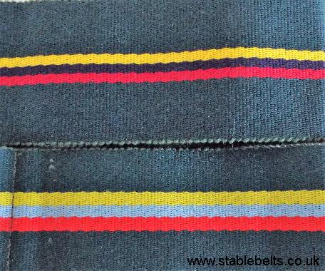 with the following colours stripped through: gold, navy blue and Scarlet red.