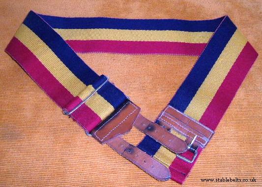 I can tell you that the 3 colours of blue, yellow and red are all in inch in width and that the belt is worn so that the blue is on top. The leather is tan in colour, the buckle is worn by the left hip.
