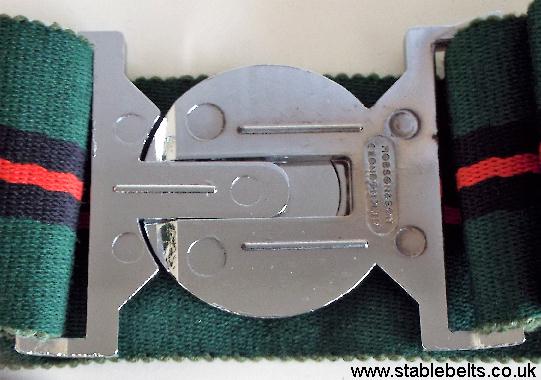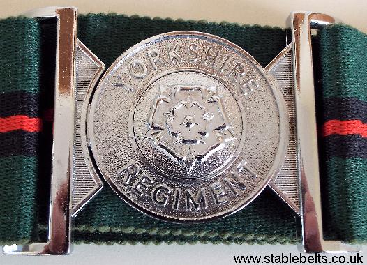 - Brunswick Green, Black and Scarlet. Chrome locket buckle, with rose in the centre, encircled by 'Yorkshire Regiment'