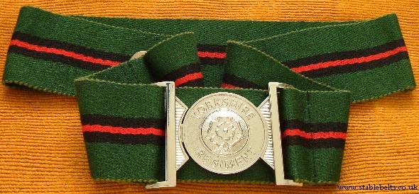 - Brunswick Green, Black and Scarlet. Chrome locket buckle, with rose in the centre, encircled by 'Yorkshire Regiment'